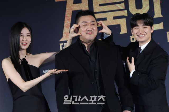 2일 오전 서울 광진구 롯데시네마 건대입구에서는 영화 ‘거룩한 밤: 데몬헌터스’(이하 ‘거룩한 밤’) 제작보고회가 열렸다. 이 자리에는 마동석을 비롯해 서현, 이다윗, 경수진, 정지소, 임대희 감독이 참석했다.