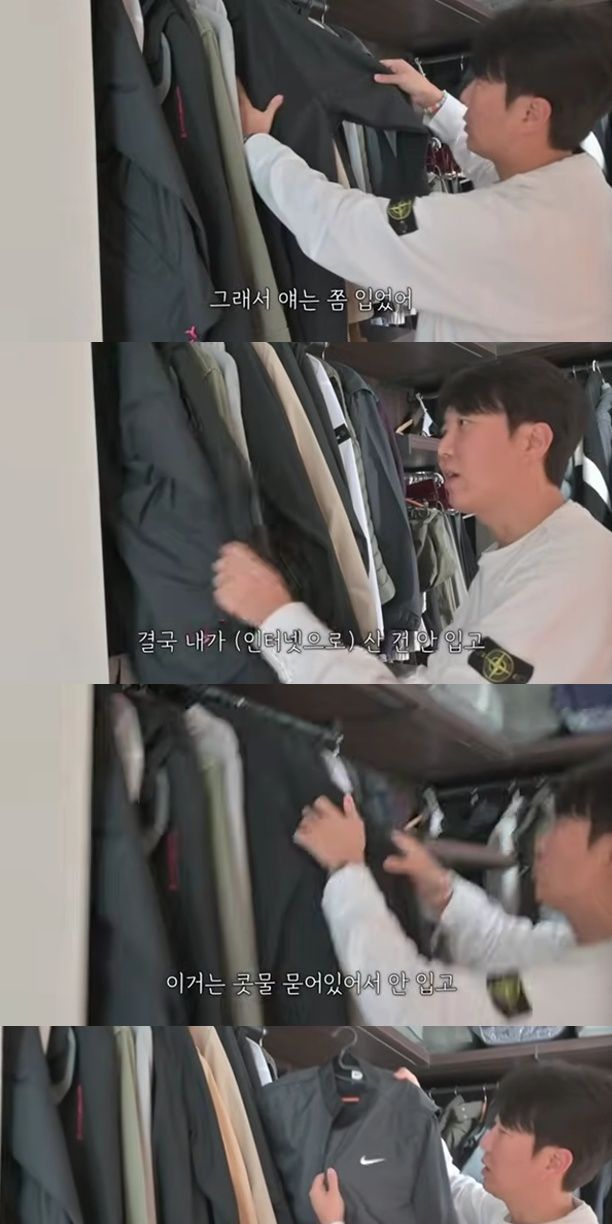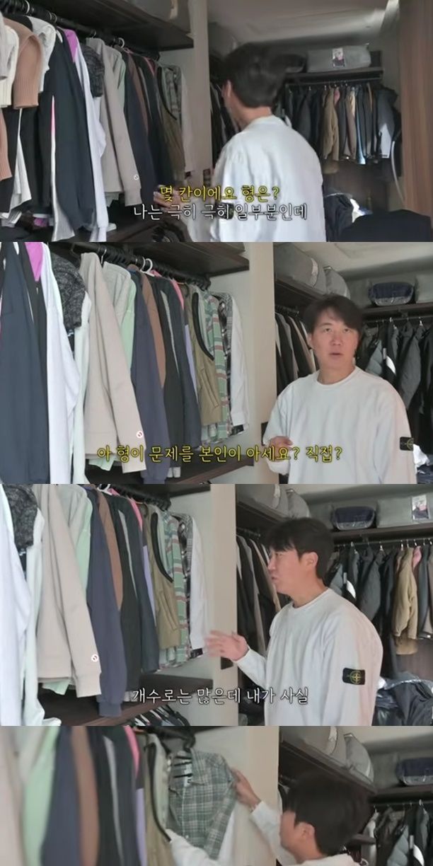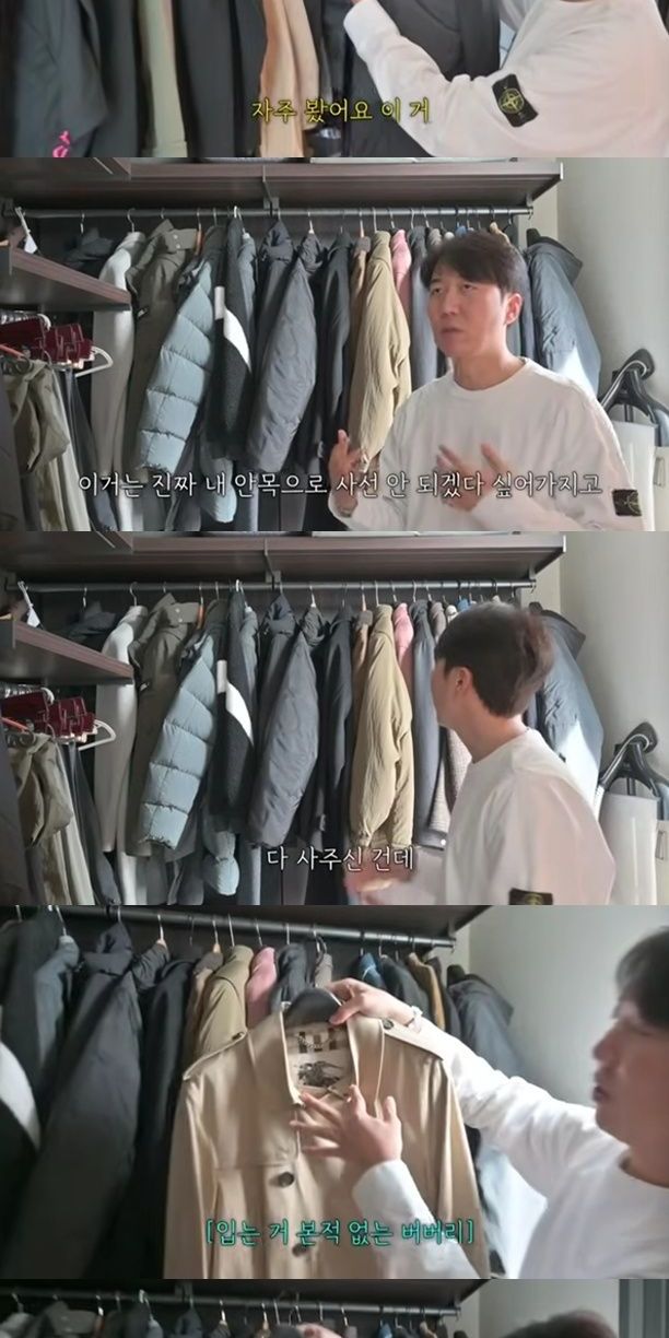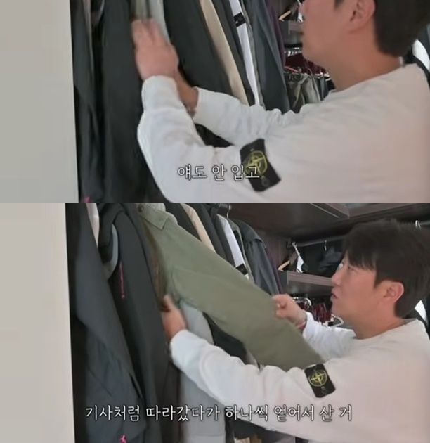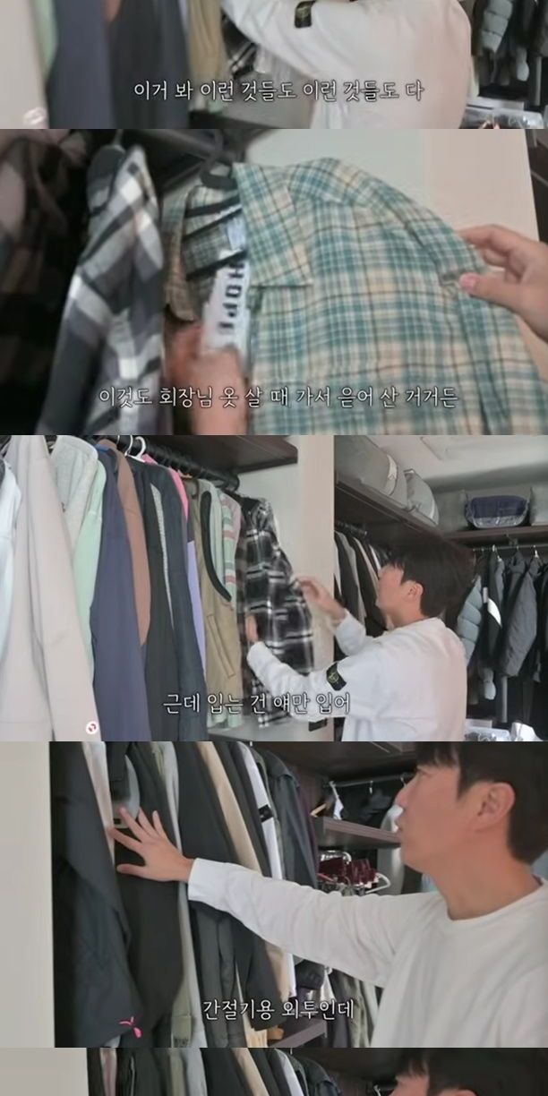 또 "간절기용 외투인데 얘도 안 입고 얘도 안 입고 얘도 안 입는다. 얘는 약간 입었다. 특징이 뭐냐면 내가 산 건 안 입고 회장님이 옷 쇼핑할 때 기사처럼 따라가다가 하나씩 얻어서 산 거다"라며 입는 옷만 입는 습관을 고백했다.