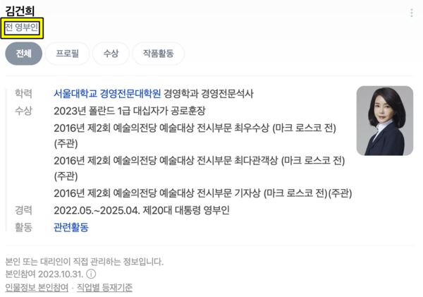 윤 전 대통령의 파면과 함께 그의 배우자인 김건희 여사에 대한 정보도 빠르게 정정됐다. 5일 기준 포털사이트 네이버, 다음, 네이트 등 주요 국내 검색 플랫폼에서 ‘김건희 여사’를 검색하면 ‘전 영부인’이라는 호칭이 등장한다.