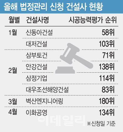 박철한 한국건설산업연구원 연구위원은 “2020년 전후로 착공이 많이 이뤄졌는데 이들 공사의 완공 시점은 재작년, 작년이어서 그나마도 건설사에 돈이 들어왔는데 2023년 이후 착공이 크게 줄어들면서 건설사들은 현금흐름 자체가 줄어드는 구간에 있다”고 밝혔다. 이어 “작년 하반기부터 올해, 내년 상반기까지 건설사로선 정말 힘든 구간이 될 것”이라고 덧붙였다. 그러다 보니 빚을 갚지 못해 채무불이행으로 올 들어 이날 현재까지 법정관리를 신청한 건설사는 신동아건설, 삼부토건, 대우조선해양, 안강건설, 이화공영 등 8곳에 달했다. 1~3월 4곳의 건설업 등록 업체에서 부도가 났고, 925개 종합 또는 전문공사업체는 폐업(일부 폐업 포함)했다.