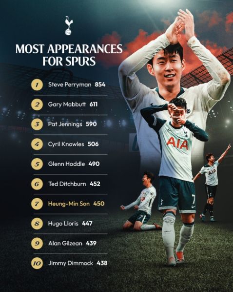 손흥민은 역대 토트넘 소속 선수 중 7위에 해당하는 많은 경기를 소화한 주인공이다. 역대 1위는 스티브 페리먼의 854경기, 2위는 개리 마벗(611경기), 3위는 팻 제닝스(590경기), 4위 시릴 놀스(506경기), 5위는 글렌 호들(490경기)다. 모두 전설적인 축구 원로들의 기록이다.