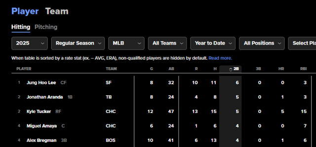 이정후의 시즌 6번째 2루타였다. 이 2루타로 이정후는 MLB 전체 2루타 1위에 올랐다. 지난 6일 경기에서 2루타 2개 포함 3안타 맹타를 휘둘렀던 이정후는 2경기 만에 2루타 3개를 몰아치며 이 부문 1위에 올랐다.