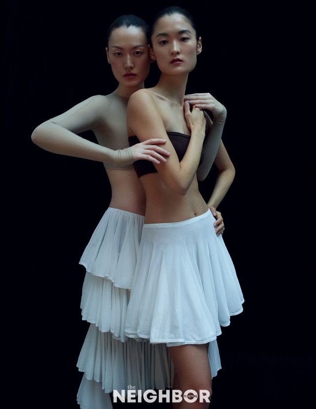 (오른쪽) 스트레치 메시 소재의 셔츠 재킷 4백35만원, 동일한 소재의 미드카프 스커트 1백66만원, 이너로 착용한 브라와 브리프 가격 미정.