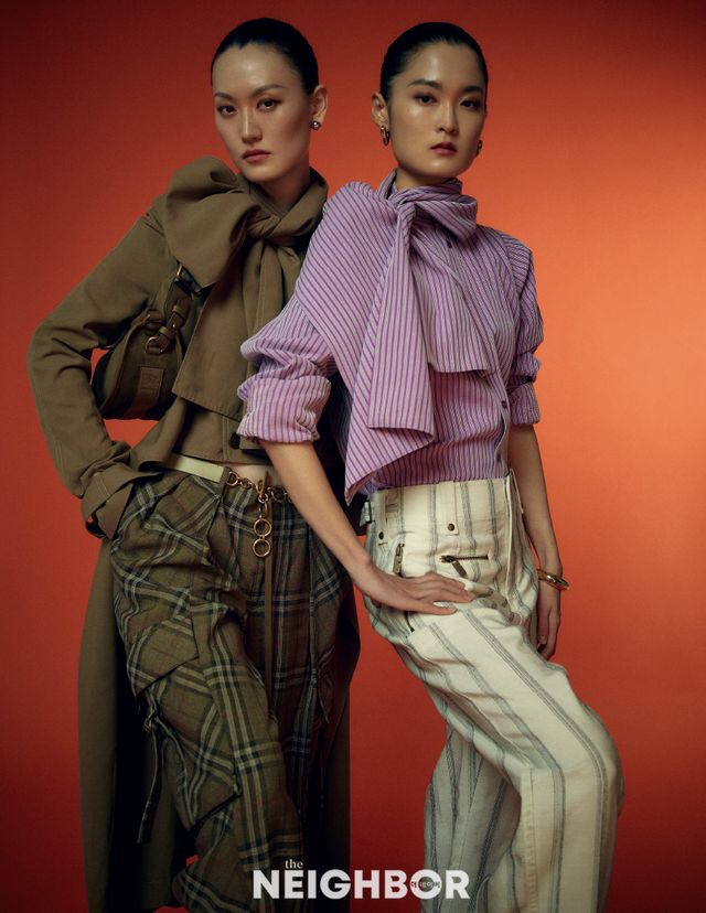 (왼쪽) 앞면의 과감한 크롭트 디자인이 특징인 롱 실크 스카프 트렌치코트 4백89만원, 독특한 질감의 버버리 체크 실크 혼방 소재 카고 팬츠 3백49만원, 스웨이드 소재의 B 클립 숄더백 2백75만원, 링 체인 디자인의 레더 벨트 78만원, 실버 이어링 가격 미정.