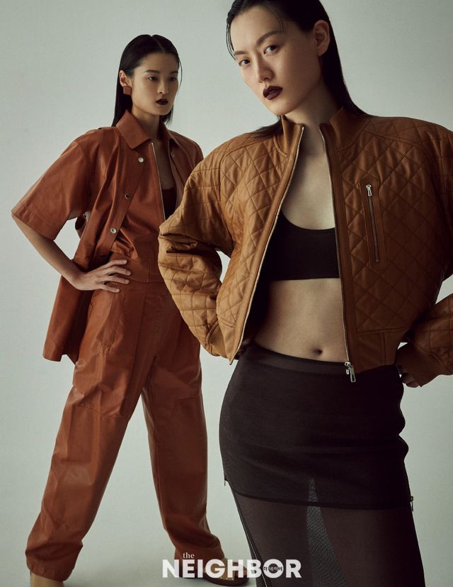 (오른쪽) 퀼팅 디테일의 브라운 카프스킨 보머 재킷, 에보니 브라운 컬러의 지퍼 디테일 롱스커트, 그 위로 레이어드한 미니스커트, 울 브라톱 모두 가격 미정.