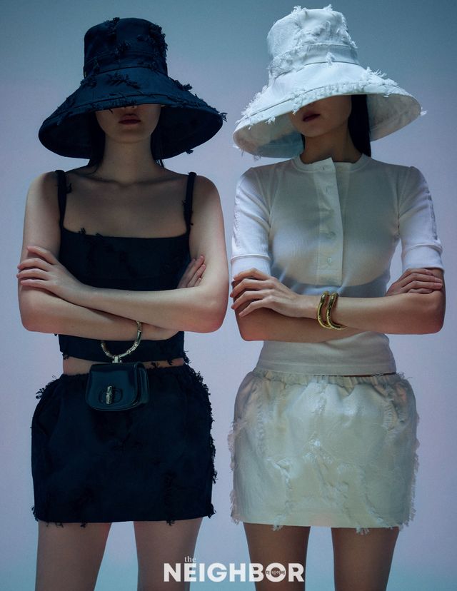 (오른쪽) 와이드 브림 햇, 마더오브펄 버튼 디테일의 화이트 리브드 니트 톱, 뱀부 모티프의 골드 피니시 브레이슬릿 모두 가격 미정, 플로라 자카드 소재로 낭만성을 부여한 튤립 실루엣 미니스커트 2백만원대.