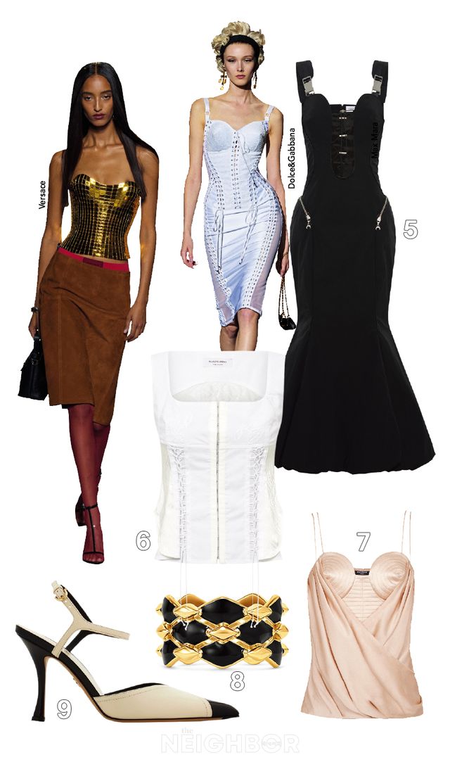 7 Balmain 독특한 원뿔 모양의 버스트 디자인이 특징인 뷔스티에 위로 드레이퍼리 디테일의 슬리브리스 패널을 더한 톱 가격 미정.