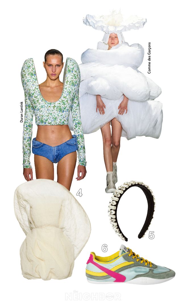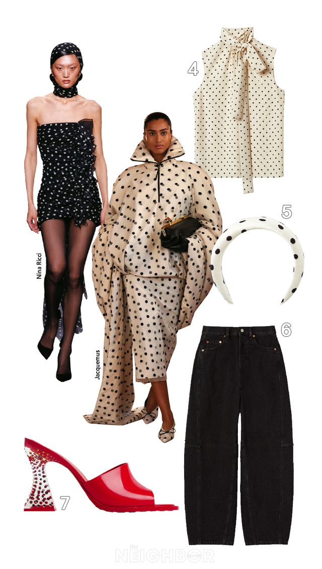 4 Miu Miu 레트로 무드를 강조한 폴카 도트 슬리브리스 톱. 스카프 칼라를 더해 다양한 스타일링이 가능하다. 가격 미정.