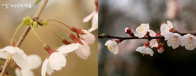 왼쪽 왕벚나무(꽃자루가 김), 오른쪽 살구나무(꽃받침이 젖혀짐). / 서울시 제공
