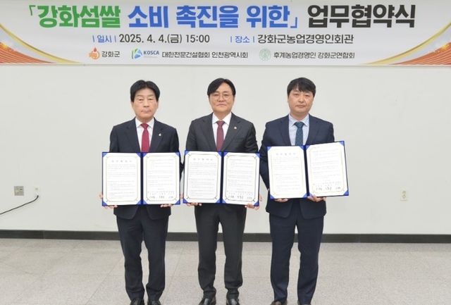 이번 협약에 따라 대한전문건설협회 인천광역시회는 강화섬쌀을 3차례에 걸쳐 총 37.1톤 구매할 예정이다. 이는 80kg 기준 464가마에 해당하는 규모다.