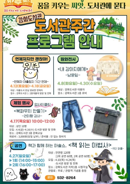 강화읍에 위치한 강화도서관에서는 ▲책 읽는 마법사 공연 ▲ 북 파우치 만들기 등 체험행사 ▲‘내 강아지에게’ 원화 전시를 운영한다.