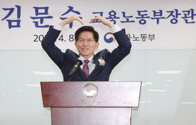 김문수 고용노동부 장관이 8일 오후 정부세종청사에서 열린 이임식에서 이임사를 하고 있다.(사진=연합뉴스)