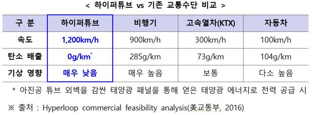 하이퍼튜브는 진공 상태에 가까운 튜브 속에서 차량이 공기 저항 없이 자기부상 상태로 주행하는 구조로, 이론상 최고 속도는 시속 1,200km를 넘는다. 국토부는 “지상 기반 교통수단 중 세계 최고 수준의 속도 구현을 목표로 한다”고 밝혔다.