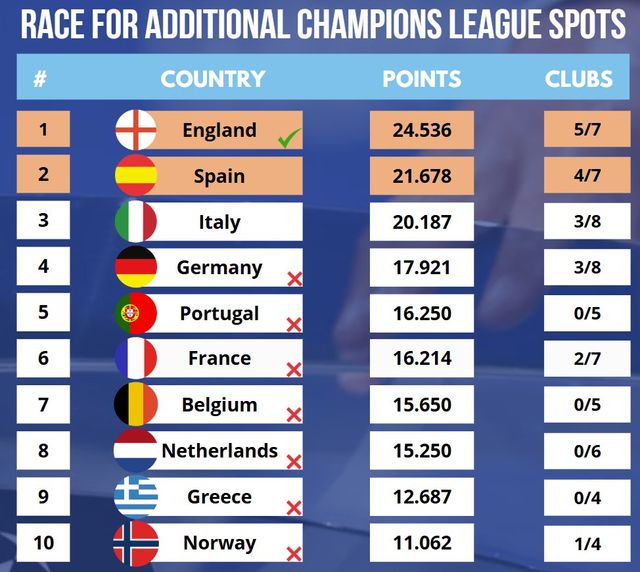계수 순위 상위 두 국가는 다음 시즌 챔피언스리그 진출권을 추가로 얻게 된다. 이 진출권은 리그에서 챔피언스리그 진출권을 얻는 순위 바로 아래 순위 팀이 얻는다. 프리미어리그는 상위 4팀이 자동으로 챔피언스리그에 진출한다. 추가 진출권은 그래서 5위 팀에게 갈 것이다.