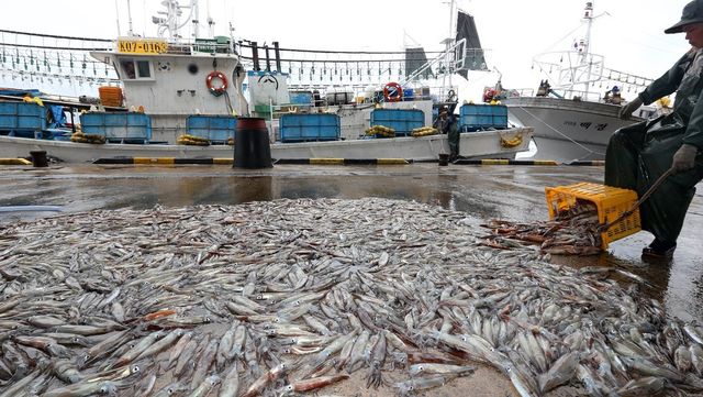경북 울릉군 울릉읍 저동리 수협위판장에서 작업자들이 말리기 위해 내장 등을 손질한 오징어를 차에 싣고 있는 모습 / 연합뉴스