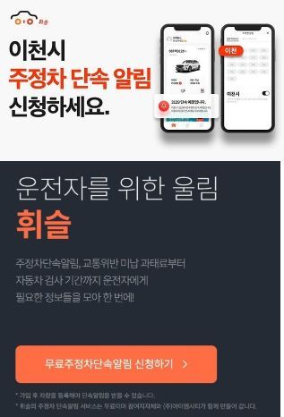 주차단속 알림 서비스인 ‘휘슬’ 앱은 운전자가 시시티브이(CCTV) 단속 지역에 불법 주정차하면 단속되기 전 운전자에게 앱 알림 또는 전화로 단속될 수 있음을 사전에 알려준다. 이를 통해 차량의 신속한 자진 이동을 유도하여 원활한 통행이 이루어질 수 있도록 했다.
