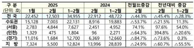 또한 올해 1~2월 누계 기준 수도권 주택 착공 실적은 8434가구로 전년 동기(1만6140가구) 대비 47.7% 줄었다. 같은 기간 수도권 주택 준공 실적은 2만6677가구로 전년 동기(3만5146가구) 대비 24.1% 감소했다.