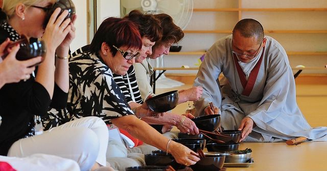 대구세계에너지총회 참가자와 가족들이 2013 대구 동화사 국제선수련관 참선당에 방문해 발우공양 체험을 하고 있다. / 뉴스1