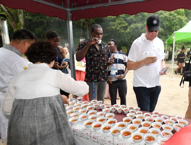 2019년 전남 장성 백양사에서 열린 '2019 광주세계수영선수권대회 발우공양' 행사에 참가한 외국인들이 녹찻잎을 누런빛이 나도록 말려 만든 황차를 맛보고 있다. / 뉴스1