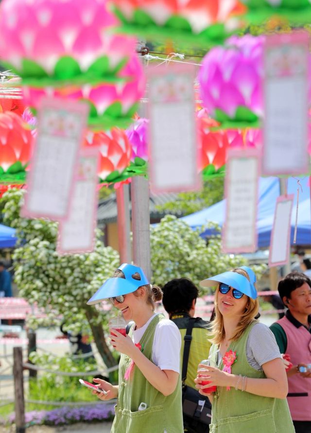 2019년 전북 김제시 금산사에서 열린 불기 2563년 부처님 오신 날 봉축법요식에서 템플스테이를 위해 찾아온 외국 여성들이 연등이 장식된 경내를 걷고 있다. / 뉴스1