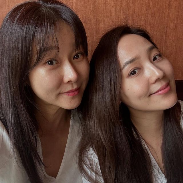 사진 속에는 현영과 유진이 다정하게 어깨를 맞대고 미소 짓는 모습이 담겨 있다. 옅은 화장의 수수한 매력이 눈길을 사로잡는다.