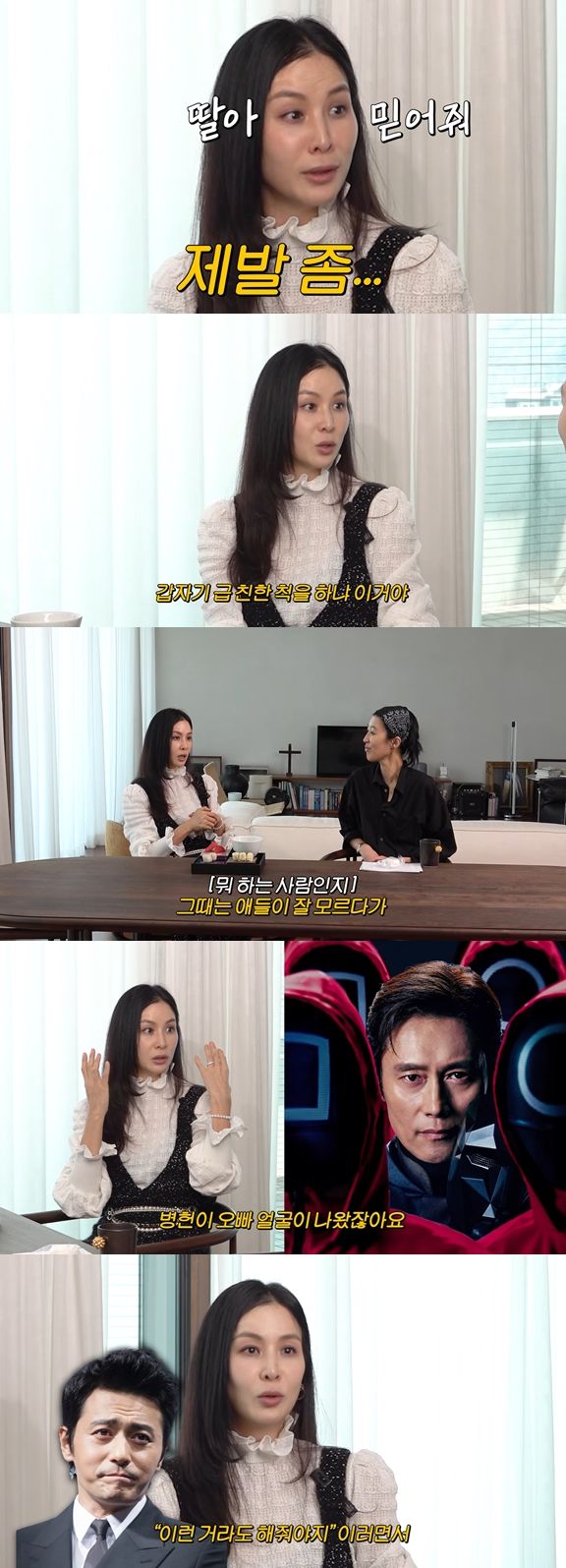고소영은 "얼마 전에 신랑이 (이)병헌이 오빠 시사회를 갔다왔다. 어렸을 때 맨날 집에 놀러 왔다. 그때는 잘 모르다가 '오징어 게임' 하면서 병헌이 오빠 얼굴이 나오지 않았나. 병헌이 삼촌 보고 싶다는 거다"라고 일화를 전했다.