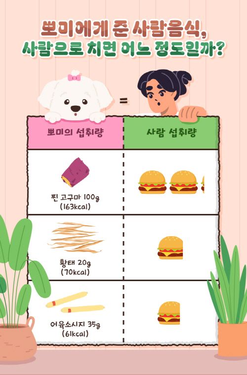-뽀미의 섭취량=찐 고구마 100g(163kcal) / 사람 섭취량=햄버거 2.1개