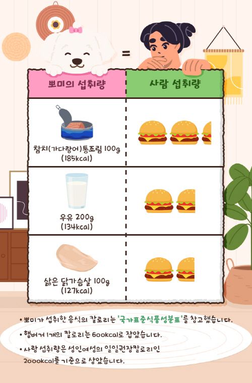 -뽀미의-뽀미의 섭취량=우유 200g(134kcal) / 사람 섭취량=햄버거 1.7개