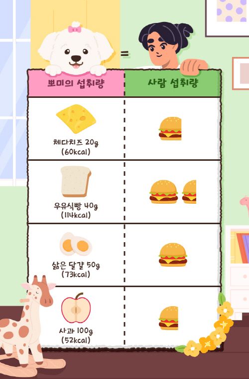 -뽀미의-뽀미의 섭취량=우유식빵 40g(114kcal) / 사람 섭취량=햄버거 1.5개