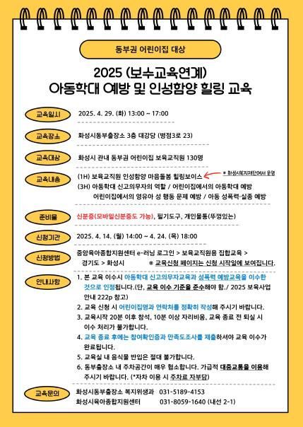 화성특례시, 동부권 보육교직원 대상 아동학대 예방 및 마음돌봄 인성교육 신청하세요