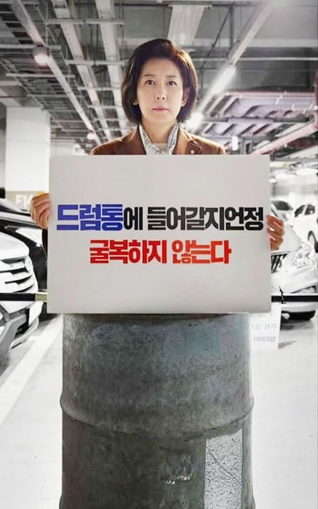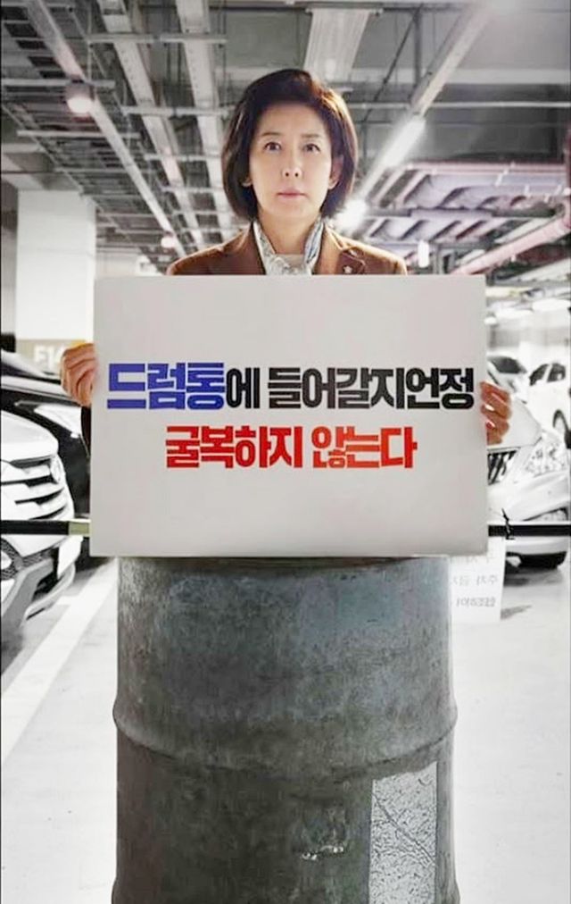 나경원 의원은 15일 자신의 인스타그램에 비장한 표정으로 드럼통에 들어가 '드럼통에 들어갈지언정 굴복하지 않는다'라고 적힌 피켓을 든 사진을 공개했다.