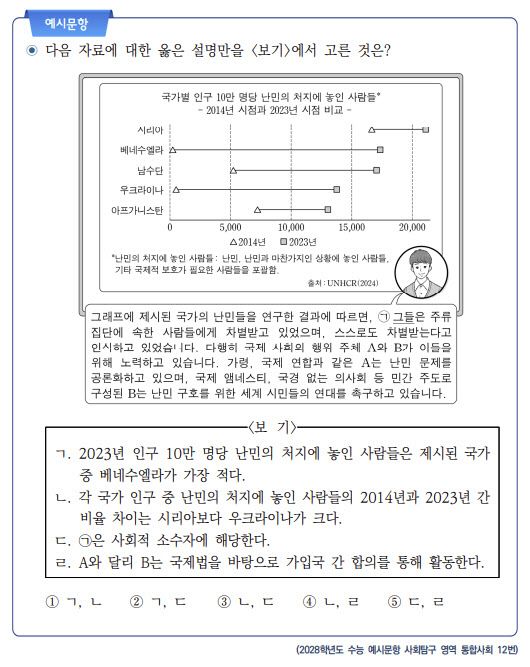 또한 12번 문항은 자료 분석·해석 문제로, 국가별 인구 10만 명당 난민 지위에 놓인 사람들의 규모 그래프를 2014년·2023년 각각 제시했다. 하단 해설에서는 난민·국제기구·비정부기구에 대한 개념을 추론할 수 있는 설명이 담겼다. 이후 수험생들에게 보기에서 자료에 대한 옳은 설명을 고르도록 했다. 해당 문항은 통합사회 2에서 ‘인권보장과 헌법’, ‘세계화와 평화’ 단원의 내용이 출제된 것이다. 평가원은 “자료에 나타난 다양한 정보를 통합 해석함으로써 사회적 소수자의 의미를 이해하고 인권문제 해결을 모색하는 국제 사회 행위 주체의 개념·역할을 제시할 수 있어야 한다”고 분석했다.