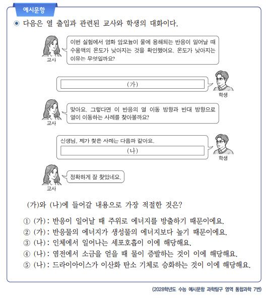 통합과학 예시문항도 함께 공개됐다. 통합과학 7번의 경우 생활 속에서 에너지를 흡수·방출하는 현상을 다뤘다. 교사와 학생 간 대화 형식을 제시해, 수험생으로 하여금 교사의 질문에 적절히 들어갈 학생의 말을 고르도록 했다. 문제를 해결하기 위해 수험생들은 발열·흡열 반응과 관련해 옳은 선택지를 고르면 된다. 해당 문항은 통합과학2의 ‘변화와 다양성’ 단원에 해당한다. 평가원은 “단순히 화학 반응에 국한해 에너지 출입을 다루기보다 다양한 지구·생명 현상에 적용되는 사례를 찾아보는 연습이 필요하다”고 설명했다.