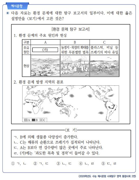 통합사회 예시문항 2번은 사막화·열대림 파괴·쓰레기섬 등 환경 문제의 특성과 이러한 문제가 발생하는 지역을 지도로 제시한 탐구 보고서를 활용했다. 이후 보기에서 보고서 서술과 연관된 지역·특징에 대해 맞는 설명을 고르도록 구성됐다. 이는 2022 개정 통합사회 중 통합사회1의 ‘자연환경과 인간’ 단원에서 제시하는 성취 수준 달성 여부를 평가하는 문제다. 평가원은 “환경 문제의 분포가 나타난 지도자료를 숙지하고 해당 환경 문제의 원인·확산 과정·대책을 연관 지어 탐구하는 통합적 학습이 필요하다”고 설명했다.