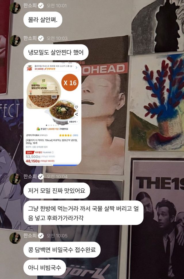 바로먹는 발효곤약 냉모밀 한소희가 냉모밀은 살 안찐다며 강력 추천하는 제품. 국물까지도 바로 먹을 수 있고, 국물을 다 마셔도 70kcal(1인분 기준)로 칼로리 부담도 적다. “국물은 살짝 버리고 얼음 넣고 후루룩 먹는다”는 그의 말처럼, 더운 여름에는 바로 먹으면 사먹는 냉모밀 부럽지 않은 맛으로 식감이 살아난다고. 겨울철엔 전자레인지에 딱 1분 정도만 돌려서 따뜻하게 데워 온모밀로도 충분히 활용 가능하다. 특허를 받은 곤약 면이 소스를 제대로 빨아 들여 맛을 배가한다고. 전혀 다이어트 식단 같지 않다는 평이 대부분이다.