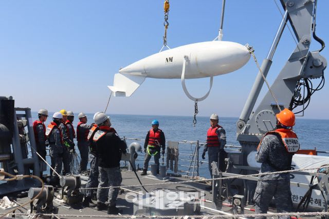 | 연합 기뢰전 훈련에 참가한 기뢰탐색함 김화함 장병들이 기뢰 제거를 위해 무인기뢰처리기(MDV)를 해상으로 진수하고 있다. (사진=해군) |