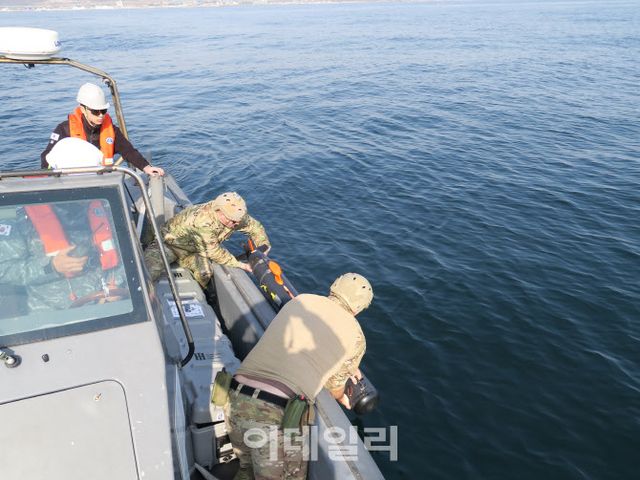 | 연합 기뢰전 훈련에 참가한 한미 장병들이 고속단정(RIB)에서 무인기뢰탐색체(UUV)를 진수하고 있다. (사진=해군) |