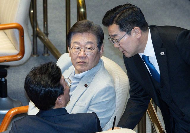제21대 대통령선거에 출마를 선언한 이재명 전 더불어민주당 대표와 박찬대 직무대행, 김민석 최고위원이 14일 오후 서울 여의도 국회에서 열린 제424회 국회(임시회) 제2차 본회의에서 대화를 하고 있다. / 뉴스1