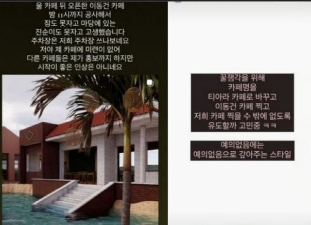 카페 사장 A씨는 자신의 SNS에 “우리 카페 뒤 오픈한 이동건 카페. 밤 11시까지 공사해서 잠도 못 자고 마당에 있는 진순이(반려견)도 못 자고 고생했다”며 “주차장은 저희 주차장을 쓰나 보다. 저야 제 카페에 미련이 없어 다른 카페들은 제가 홍보까지 하지만, 시작이 좋은 인상은 아니다”라고 지적했다.