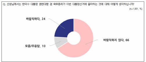17일 발표된 전국지표조사(NBS)에 따르면, 한 권한대행의 대선 출마에 대해 ‘바람직하지 않다’고 응답한 비율은 전체의 66%에 달했다. 반면 ‘바람직하다’는 긍정 응답은 24%에 그쳤다.