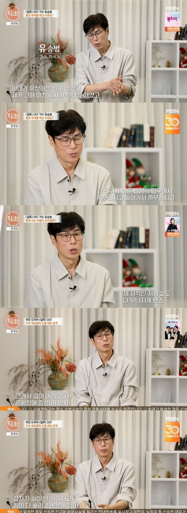 유승범은 "사업이 무너졌을 때 저 때문에 돈을 많이 번 분한테 도움을 좀 받으러 갔다. 비서를 시켜서 돈봉투를 주고 도망가 버리셨더라. 그거 들고 걸어 내려오다가 공황장애 증상이 왔다. 갑자기 숨이 안 쉬어지고 힘이 다 풀리고 온몸에 땀이 나고... 그렇게 몇 시간을 바닥에서 뒹굴었다"라고 고백했다.