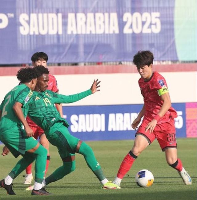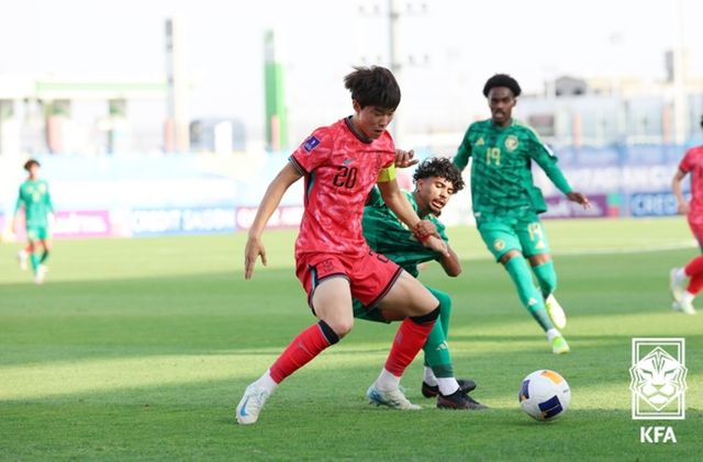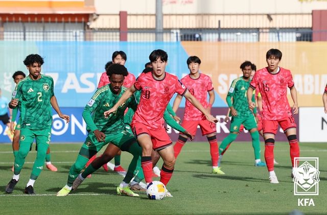 한국 사우디아라비아 경기 장면. 한국 U-17 축구대표팀은 이날 경기 전반 45분에 터진 오하람(광양제철고)의 선제골을 끝까지 지키지 못하고 사우디와 1-1로 비겼다. 이후 벌어진 승부차기에서 1-3으로 완패했다. 한국은 이번에 2002년 대회 이후 23년 만의 우승을 노렸으나 4강 고지에서 아쉽게 패해 아시안컵에서 탈락하고 말았다. / 대한축구협회 인스타그램