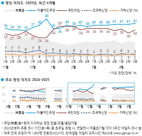 정당 지지도는 민주당 42%, 국민의힘 34%, 조국혁신당 3%, 개혁신당 2%였다. 지지 정당이 없는 무당층은 18%로 집계됐다.
