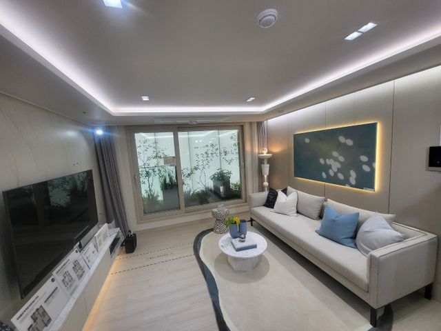 '해링턴 스퀘어 산곡역' 모델하우스 내 마련된 전용 59㎡A 타입 거실 모습. (사진=이재성 기자)