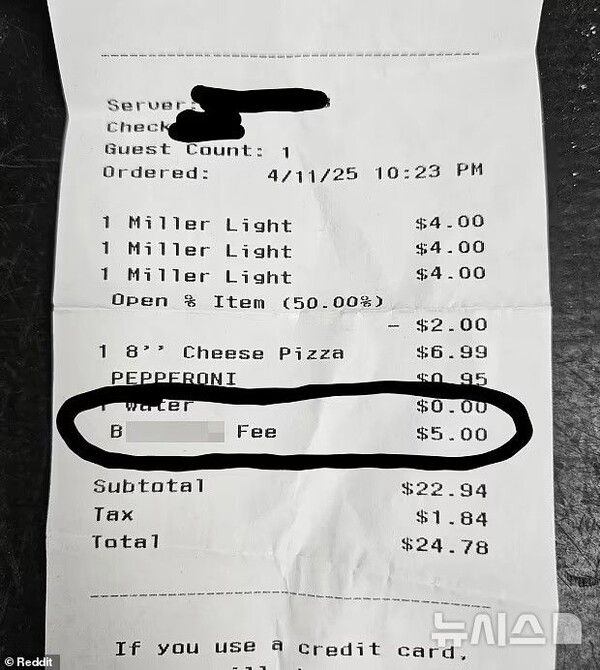 온라인 커뮤니티 레딧에 올라온 해당 영수증 사진에는 각 4달러의 맥주 3잔, 7.94달러의 페퍼로니 피자 한 판, 그리고 5달러의 '썅X 수수료(b****ing fee)'가 추가됐다.