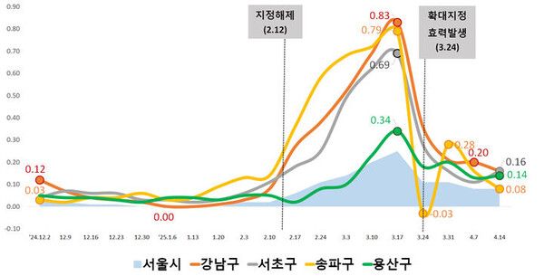 토지거래허가구역 인근 지역인 마포구는 0.29%에서 0.13%로, 성동구는 0.37%에서 0.23%로, 강동구는 0.28%에서 0.09%로 상승폭이 줄었다. 토지거래허가구역에 따른 풍선 효과는 아직 없다고 시는 밝혔다.