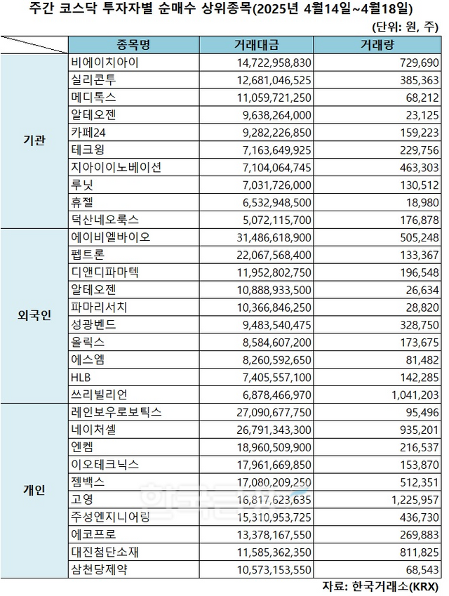 기관 '비에이치아이'·외인 '에이비엘바이오'·개인 '레인보우로보틱스' 1위 [주간 코스닥 순매수- 2025년 4월14일~4월18일]