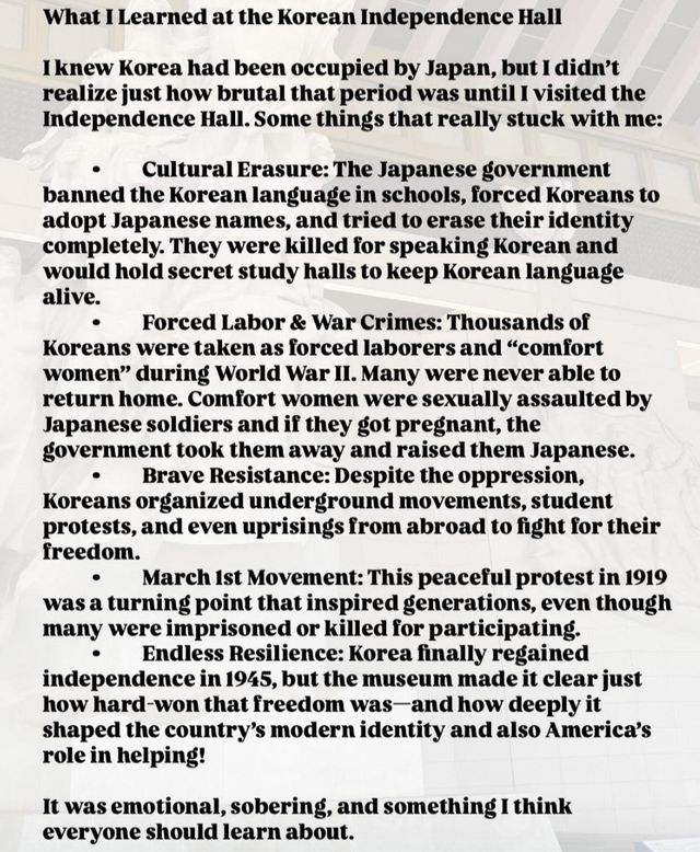 헤일리는 "한국이 일본에게 점령당했다는 것은 알고 있었으나 독립기념관 방문하기 전까지는 그 시기가 얼마나 잔혹했는지 제대로 알지 못했다"며 "일본 정부는 학교에서 한국어 사용을 금지하고, 한국인들에게 일본식 이름(창씨개명)을 강요했다. 그들의 정체성을 없애려 했다. (한국인들은)한국어를 사용했다는 이유로 살해되기도 했고, 한국어를 지키기 위해 비밀리에 공부 모임을 열기도 했다"고 했다.