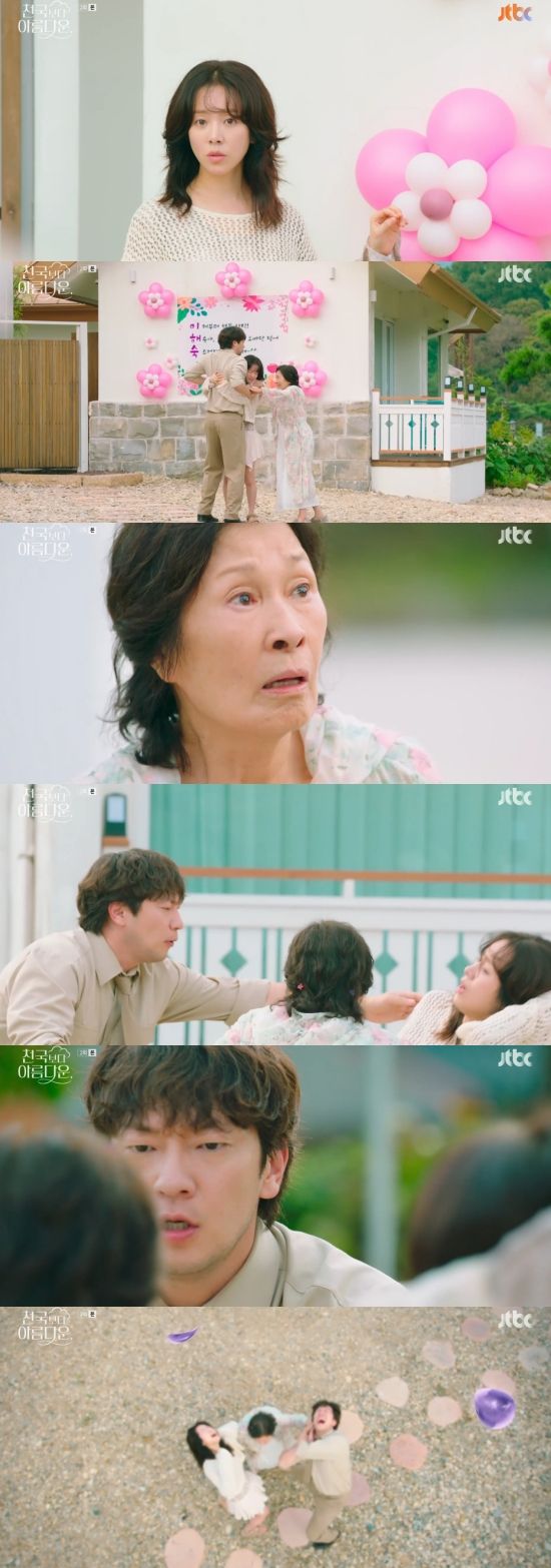 20일 방송된 JTBC 새 토일드라마 '천국보다 아름다운' 2회에서는 이해숙(김혜자 분)이 고낙준(손석구)의 품에 안긴 솜이(한지민)의 머리채를 잡는 모습이 그려졌다.