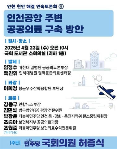 이번 토론회는 허종식 의원이 기획한 ‘인천 현안 해결 연속토론회’ 다섯 번째로, 무안공항 항공기 참사와 영종지역 임산부 응급실 ‘뺑뺑이’ 사건 등에 따라 공항 주변 의료체계에 대한 정책 방안을 공론화하기 위해 마련됐다.